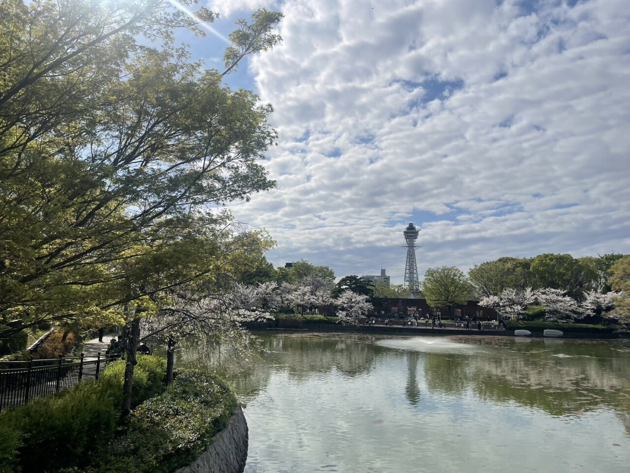 In the park, you can spot Tsutenkaku Tower in the distance. Sitting on a bench, I found myself quietly enjoying the cherry blossoms under a clear blue sky.