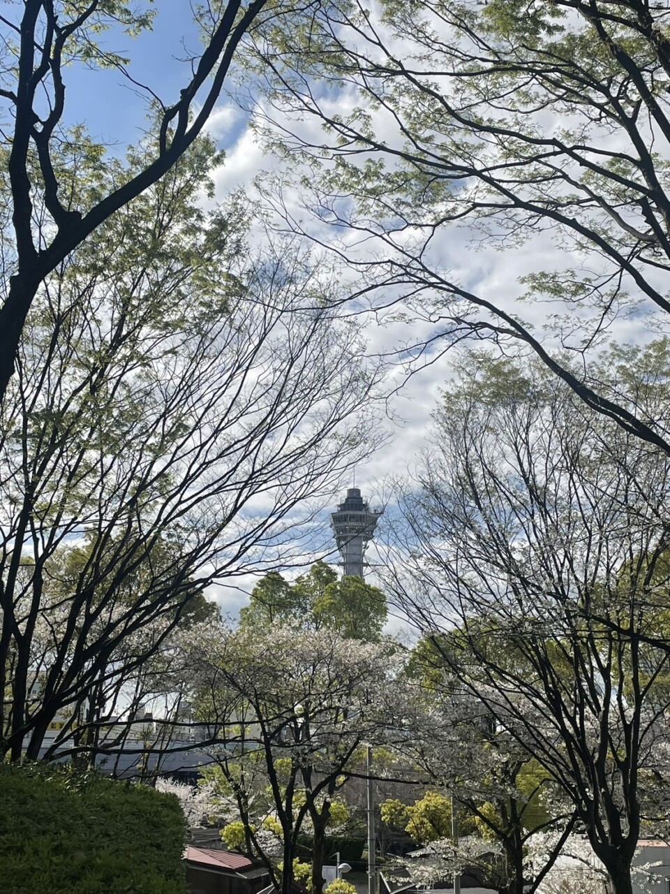 公園では遠くに「通天閣」を眺めながら、ベンチで青空と桜をゆっくり楽しめました。